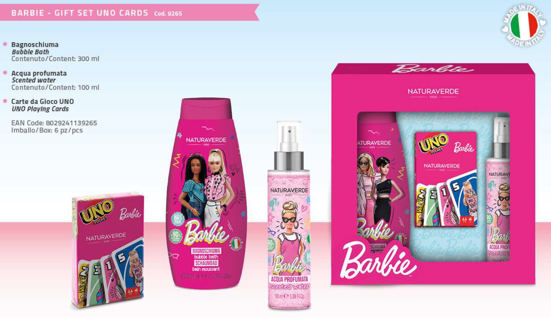 DISNEY BARBIE CONF BAGNO 300+ACQUA PROF +CARTE UNO 9265