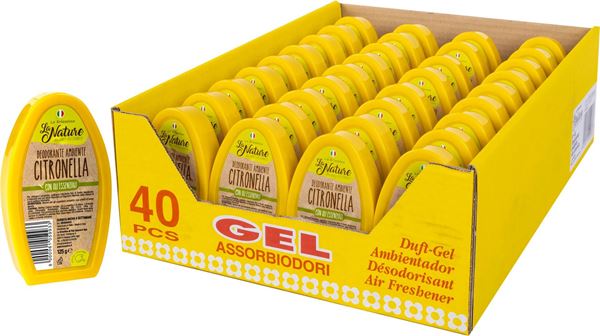 Lemongrass room freshener gel, ideal for perfuming bathrooms, shoe cupboards and small rooms. Eliminates unpleasant odours.