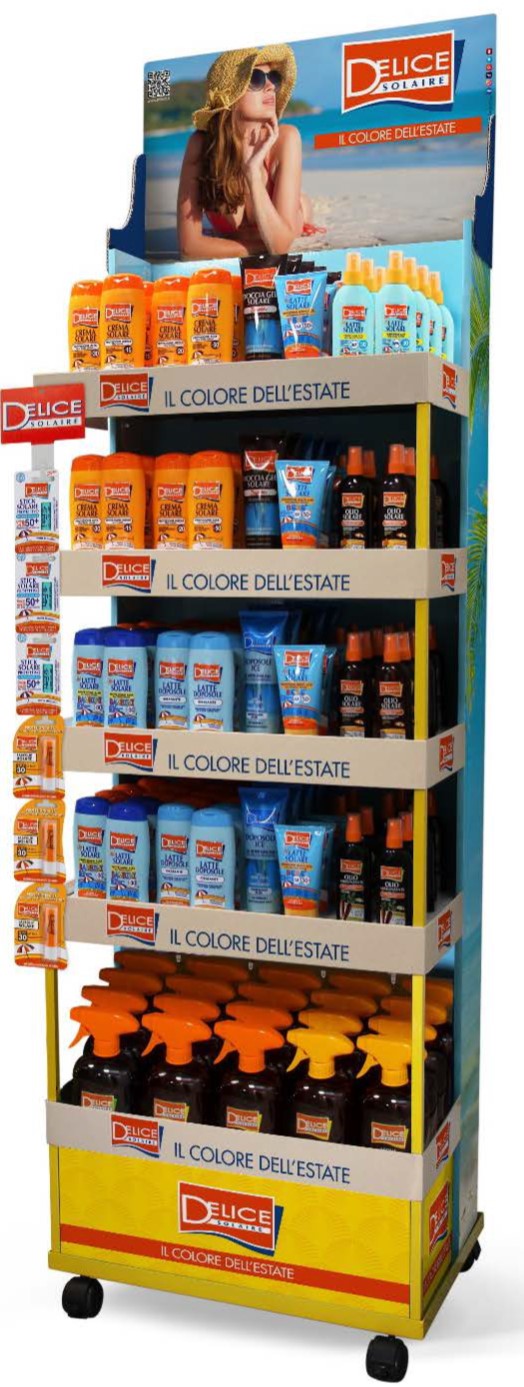 Espositore da terra Delice della linea solari con 222 pezzi. In espositore le linee di protezione solare per grandi e piccini con diversi gradi di protezione, oli e acque abbronzanti, la linea doposole e gli stick.