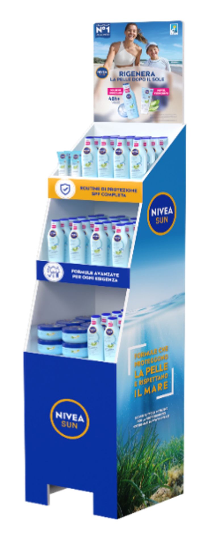 Espositore Nivea da 66 pezzi. In espositore la linea solari doposole in formato vaso e tubo idratanti e rigeneranti.